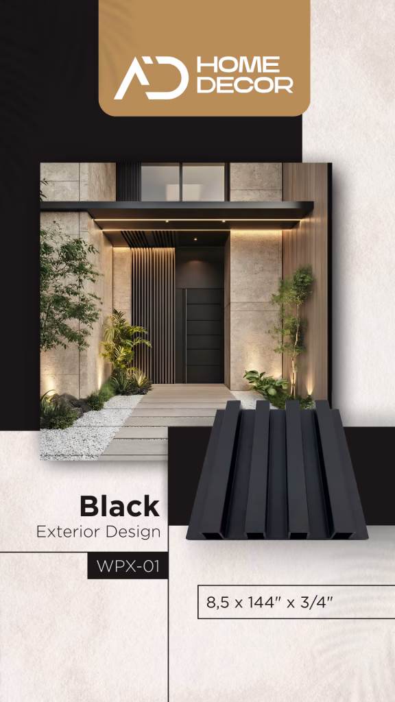desarrollamos para AD Home Decor un material gráfico promocional (flyer) centrado en el panel de pared exterior Black Exterior Design (código WPX-01). Este activo se diseñó para comunicar la estética moderna del producto, mostrando su aplicación en la fachada de una vivienda contemporánea. Además de la referencia visual, el flyer comunica las especificaciones técnicas exactas del panel en dimensiones de $8.5 \times 144″ \times 3/4″$, sirviendo como una herramienta de marketing directo que combina la estética premium con la información técnica esencial.