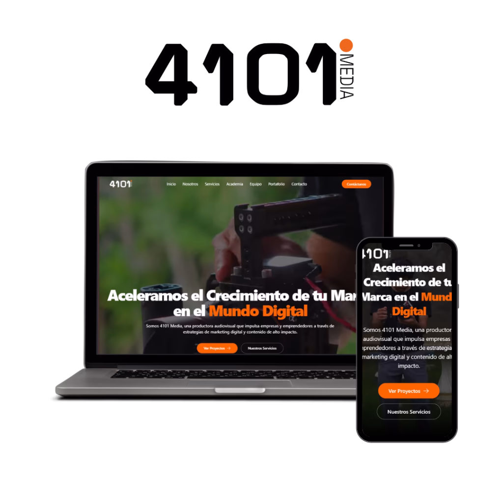 Desarrollamos esta plataforma web corporativa para 4101 Media, la sede en Venezuela de la empresa, con el objetivo de posicionarla como una productora audiovisual estratégica que acelera el crecimiento de marcas en el ámbito digital. El sitio fue diseñado full responsive, lo cual se evidencia en la vista optimizada para dispositivos de escritorio y móviles. La propuesta de valor se comunica de manera directa en la portada: «Aceleramos el Crecimiento de tu Marca en el Mundo Digital». La descripción complementaria enfatiza el uso de estrategias de marketing digital y contenido de alto impacto para impulsar empresas y emprendedores. La navegación es integral, incluyendo secciones clave como «Nosotros», «Servicios», «Academia» y «Portafolio», y utiliza llamados a la acción (CTAs) prominentemente ubicados como «Ver Proyectos» y «Nuestros Servicios» para guiar la interacción del usuario. Este desarrollo es un activo digital clave que refuerza la identidad de marca y facilita la conversión de prospectos interesados en servicios audiovisuales estratégicos.