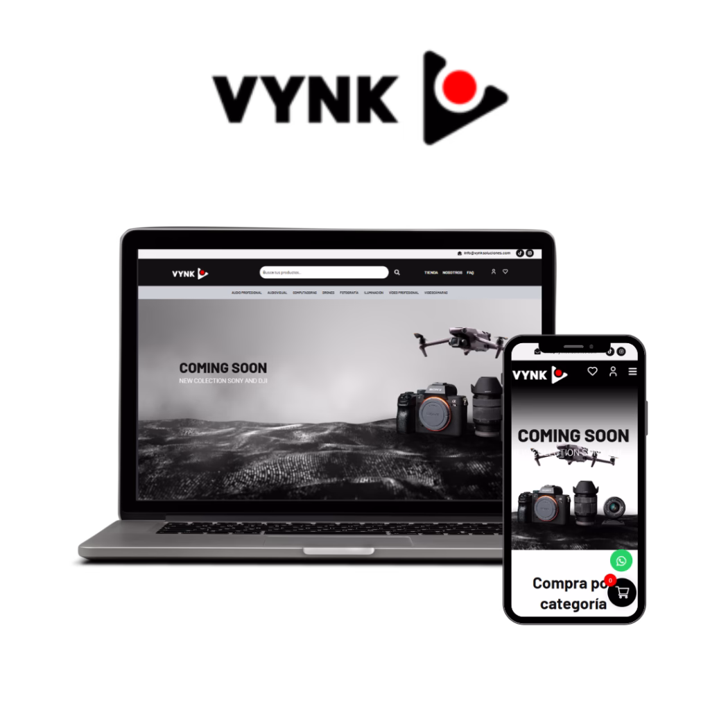 Desarrollamos esta plataforma web para VYNK, una marca enfocada en la comercialización de equipos de fotografía y video profesional. El objetivo del proyecto fue establecer una presencia digital moderna y optimizada para el comercio electrónico de productos de alta tecnología. El sitio fue diseñado full responsive, lo que garantiza una navegación y experiencia de usuario perfectas tanto en la vista de escritorio como en la móvil.